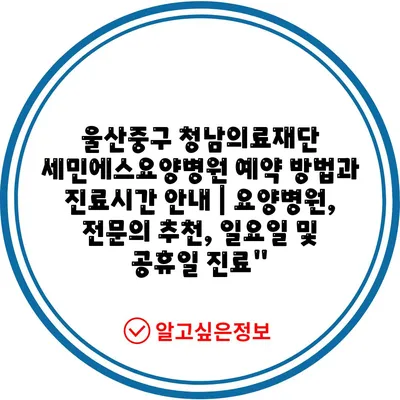 울산중구 청남의료재단 세민에스요양병원 예약 방법과 진료시간 공지 | 요양병원, 전연락 추천, 일요일 및 공휴일 진료” 에 대해 자주 묻는 질문 TOP 5