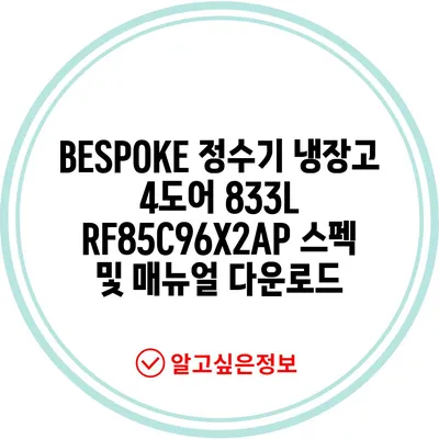 BESPOKE 정수기 냉장고 4도어 833 L RF85C96X2AP 제품을 자세히 소개하고, 스펙 매뉴얼 다운로드 링크를 제공합니다.